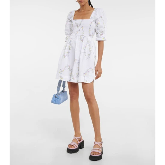 This minidress from Ganni is made from breathable cotton poplin with a shirred bodice. It’s printed with dainty flowers and features side vents and puffed sleeves finished with buttoned cuffs.