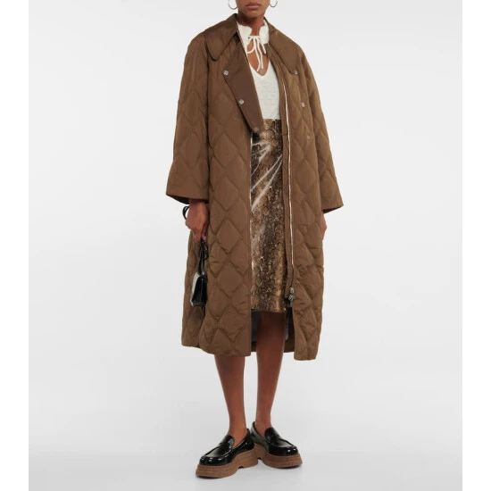 Ganni explores vintage design with this brown quilted coat, featuring a large collar. The piece has an oversized silhouette with dropped shoulders and a wide fit.