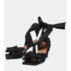 Ganni’s sandals have long, lace-up ties that wind around the ankles. A square-toed pair set on medium heels, they’re top with same-fabric bows.