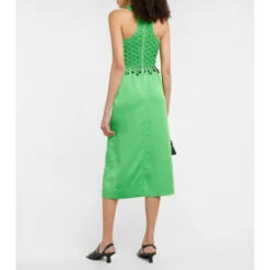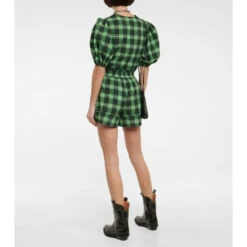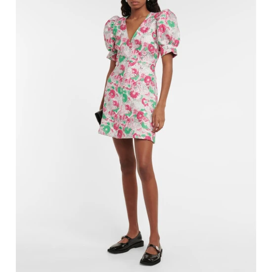 Ganni manages to marry adorable with sophisticated with this printed minidress. This piece features shiny silver-toned fabric details, a V-neckline, puff sleeves, and a flared skirt.