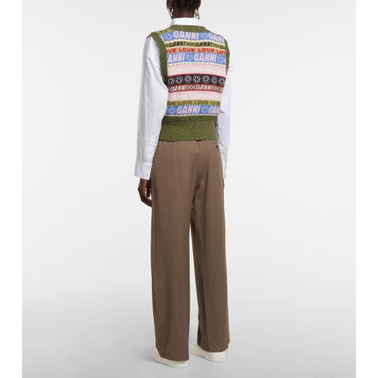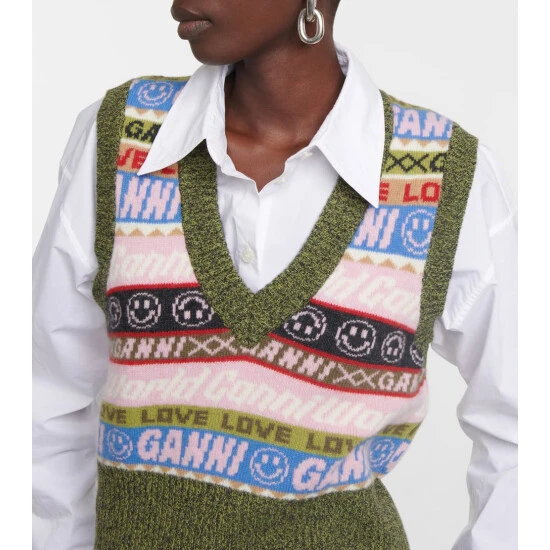 This sweater vest from Ganni is a playful option for your layered looks. The V-neck style is knitted from a striped, colorful wool blend and decorated with fun motifs and logo lettering throughout.